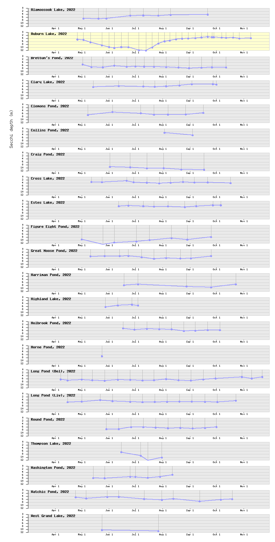 Lake Stewards of Maine Volunteer Lake Monitoring Program Near realtime Secchi lake transparency data Home > 2022 Secchi depths for selected NRTLD-monitored lakes Auburn Lake is highlighted below, if plot is enabled for it. Select season: 2022 2021 2020 2019 2018 2017 2016 2015 2014 2012 2011 2010 2009 2008 2007 2006 2005 2004 2003 2002 2001 2000 1999 1998 1997 1996 1995 1994 (2012 and earlier based on station 1 historical data) Not all NRLTD lakes are shown here... contact stevegrubb@gmail.com to request changes. Click on a plot to go to lake's detail page.