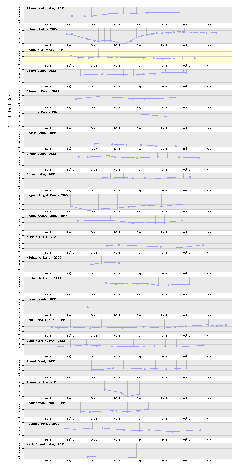 Lake Stewards of Maine Volunteer Lake Monitoring Program Near realtime Secchi lake transparency data Home > 2022 Secchi depths for selected NRTLD-monitored lakes Brettun's Pond is highlighted below, if plot is enabled for it. Select season: 2022 2021 2020 2019 2018 2017 2016 2015 2014 2012 2011 2010 2009 2008 2007 2006 2005 2004 2003 2002 2001 2000 1999 1998 1997 1996 1995 1994 (2012 and earlier based on station 1 historical data) Not all NRLTD lakes are shown here... contact stevegrubb@gmail.com to request changes. Click on a plot to go to lake's detail page.