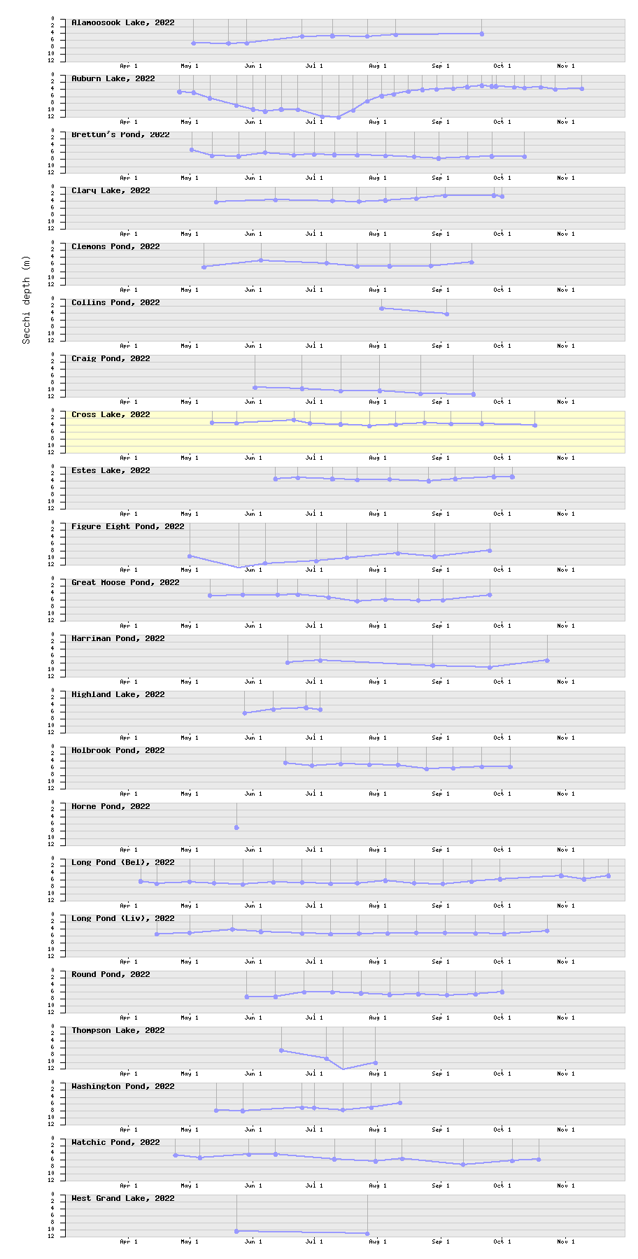 Lake Stewards of Maine Volunteer Lake Monitoring Program Near realtime Secchi lake transparency data Home > 2022 Secchi depths for selected NRTLD-monitored lakes Cross Lake is highlighted below, if plot is enabled for it. Select season: 2022 2021 2020 2019 2018 2017 2016 2015 2014 2012 2011 2010 2009 2008 2007 2006 2005 2004 2003 2002 2001 2000 1999 1998 1997 1996 1995 1994 (2012 and earlier based on station 1 historical data) Not all NRLTD lakes are shown here... contact stevegrubb@gmail.com to request changes. Click on a plot to go to lake's detail page.