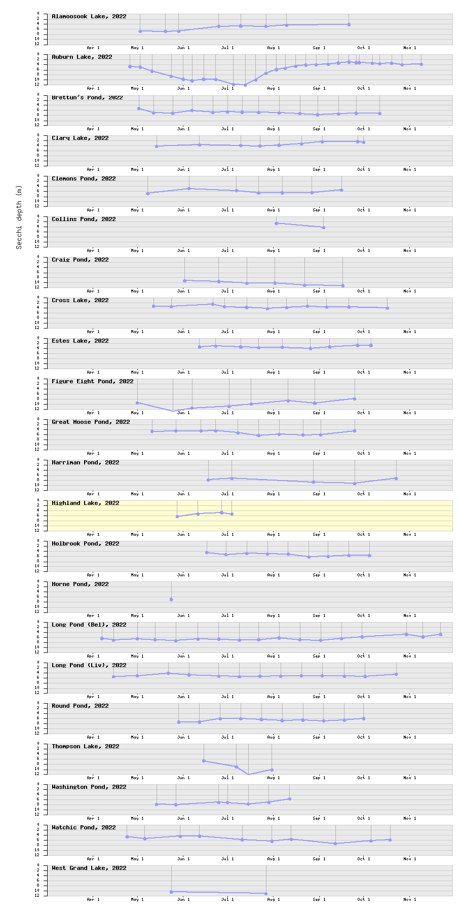 Lake Stewards of Maine Volunteer Lake Monitoring Program Near realtime Secchi lake transparency data Home > 2022 Secchi depths for selected NRTLD-monitored lakes Highland Lake is highlighted below, if plot is enabled for it. Select season: 2022 2021 2020 2019 2018 2017 2016 2015 2014 2012 2011 2010 2009 2008 2007 2006 2005 2004 2003 2002 2001 2000 1999 1998 1997 1996 1995 1994 (2012 and earlier based on station 1 historical data) Not all NRLTD lakes are shown here... contact stevegrubb@gmail.com to request changes. Click on a plot to go to lake's detail page.