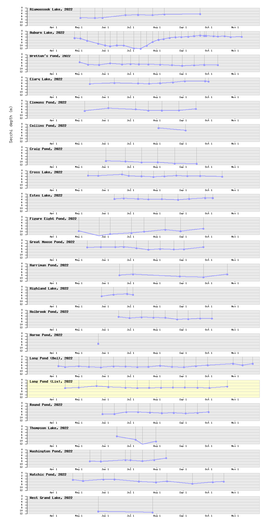 Lake Stewards of Maine Volunteer Lake Monitoring Program Near realtime Secchi lake transparency data Home > 2022 Secchi depths for selected NRTLD-monitored lakes Long Pond (Liv) is highlighted below, if plot is enabled for it. Select season: 2022 2021 2020 2019 2018 2017 2016 2015 2014 2012 2011 2010 2009 2008 2007 2006 2005 2004 2003 2002 2001 2000 1999 1998 1997 1996 1995 1994 (2012 and earlier based on station 1 historical data) Not all NRLTD lakes are shown here... contact stevegrubb@gmail.com to request changes. Click on a plot to go to lake's detail page.