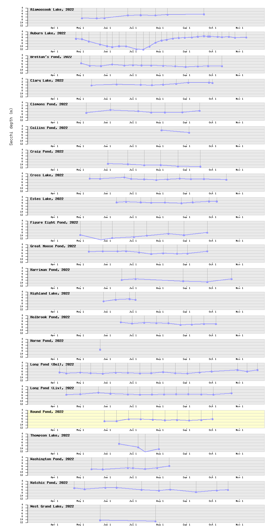 Lake Stewards of Maine Volunteer Lake Monitoring Program Near realtime Secchi lake transparency data Home > 2022 Secchi depths for selected NRTLD-monitored lakes Round Pond is highlighted below, if plot is enabled for it. Select season: 2022 2021 2020 2019 2018 2017 2016 2015 2014 2012 2011 2010 2009 2008 2007 2006 2005 2004 2003 2002 2001 2000 1999 1998 1997 1996 1995 1994 (2012 and earlier based on station 1 historical data) Not all NRLTD lakes are shown here... contact stevegrubb@gmail.com to request changes. Click on a plot to go to lake's detail page.