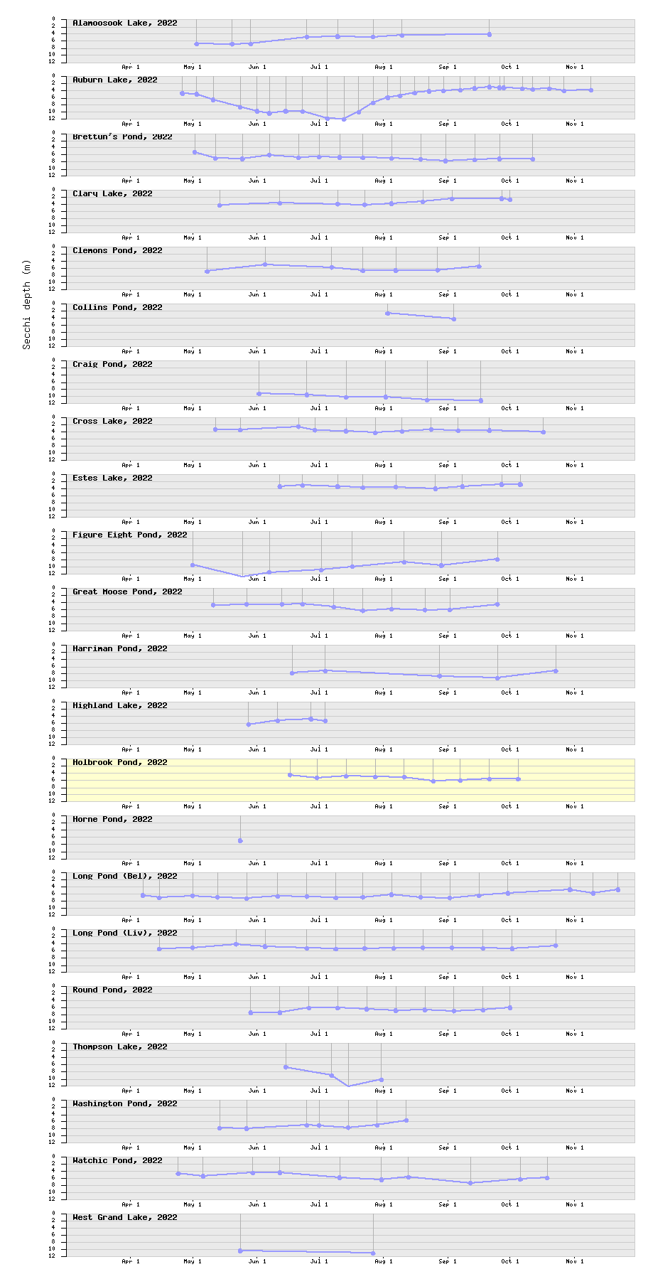 Lake Stewards of Maine Volunteer Lake Monitoring Program Near realtime Secchi lake transparency data Home > 2022 Secchi depths for selected NRTLD-monitored lakes Holbrook Pond is highlighted below, if plot is enabled for it. Select season: 2022 2021 2020 2019 2018 2017 2016 2015 2014 2012 2011 2010 2009 2008 2007 2006 2005 2004 2003 2002 2001 2000 1999 1998 1997 1996 1995 1994 (2012 and earlier based on station 1 historical data) Not all NRLTD lakes are shown here... contact stevegrubb@gmail.com to request changes. Click on a plot to go to lake's detail page.